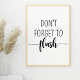 Dieses Design setzt sich zusammen aus dem Satz "Vergiss nicht, zu flush", einem Typografie-Plakat Wandkunst, die ein sauberes und modernes Design bietet, das sich perfekt für die Aufhellung und das Hinzufügen einer Persönlichkeit zu jedem Raum eignet. Dieser hübsche Ausdruck kann durch das Hinzufügen eines eigenen Textes und das Ändern der Farbgebung weiter personalisiert werden. Dieses Design hat ein modernes Ambiente und würde in einem modernen Apartment oder Loft Platz gut aussehen.