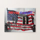 "Vergiss nie 9 11" in den US Flagge mit den Silhouetten von Rettungshelfern und Gebeten am Boden Null, um die Opfer und Helden des 11. September 2001 zu ehren und zu erinnern.