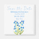Vergessen Sie nicht, Aquarellblau Blütenfeder Hochzeit speichern Sie die Dattelmagnete. Blaue botanische Blume. Einzigartige, handgemalte Kunstwerke der Künstlerin Monika Howarth. Sie können es mit Ihren Daten personalisieren.
