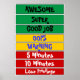 "Die Grundlagen des Systems sind: ... * Für jedes Kind gibt es ein Button. * Jeden Tag startet jeder auf "Good Job" (sauberes Schiefer). * Das Kind verschiebt den Clip um einen Platz für jede gute Tat. * Jedes Mal, wenn der Clip "Phantastisch" trifft, bekommen sie ein Pom pom in ihrem Glas. * Nur Mama oder Papa können dem Kind sagen, dass es den Clip nach oben oder unten bewegen soll, und nur Mama oder Papa können Pom-Elternteile geben. * Wenn eine schlechte Wahl wird das Kind bewegt sich ihren Clip nach "oops", und für jede schlechte Wahl danach weiter nach unten und tun die Folge. Sie überspringen die anderen Grünflächen, wenn eine schlechte Wahl getroffen wird, da das nicht "super" oder "guter Job" wäre. * Jede gute Tat bewegt sie wieder nach oben (auch wenn sie die im roten Abschnitt aufgeführten Konsequenzen nicht wiederholen würden, wenn sie aufsteigen.... Es ist nur das Konzept, langsam wieder aufzusteigen und mehrere gute Entscheidungen für die Verstärkung zu fördern. * Wenn sie sich zu jeder Zeit weigern, ihren eigenen Clip zu verschieben, dann bewegt Mama oder Papa es um 2 Stellen nach unten. * Es ist ein automatisches Rot (5 Minuten Auszeit), um jemanden absichtlich zu verletzen (Sie überspringen die "oops" und die "Warnung"). * Wenn ein Kind am Ende des Tages auf einem grünen Platz ist, bekommen sie 5 pom Poms in ihrem Glas. * Wenn das Glas voll ist, bekommt das Kind die von ihm gewählte Belohnung (Leckerei, Preis, Übernachtung mit Mama oder Papa, etc.) * Privilegien sind 1- Snacks, 2- Freundeszeit, 3-Bildschirme (TV, Computer, Telefon usw.) * Wenn ein Privileg vor 17 Uhr verloren ist, verlieren sie, wenn für die Erholung des Tages. Wenn er nach 17 Uhr verloren ist, geht er bis zum Mittagessen am nächsten Tag verloren. * Zu den guten Taten können gehören: Sprichwort "okay", durch und überprüfen Sie die Dinge, die von Mama oder Papa gefragt, mit guten Manieren, Essen alle Mahlzeiten (oder zumindest ein guter Teil der gesunden Teile), Zuhören des ersten Mal, Anziehen oder Zähneputzen, Hausaufgaben oder andere Aufgaben. * Schlechte Taten können sein: whining, Sprichwort NO, weinen (wenn nicht verletzt), beißen, schlagen, kicken, Sprichwort gemeine Dinge, nicht teilen oder nicht abschließen zugewiesene Aufgaben." - Von http://jessiepond.blogspot.com/2012/02/behavior-chart.html