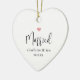Dieses wunderschöne Hochzeitsgeschenk-Ornament besticht durch hübsche Schriftzeichen und ein einfaches und modernes Design. Ein süß-rosa illustriertes Herz sitzt auf dem herzförmigen Schmuck. Verheiratete Schrift und Ihre individuelle Namen und Hochzeitstag sind leicht auf der Vorderseite des Ornaments personalisiert. Der Rücken ist ein volles Foto des neu getrauten Ehepaares. Dieses elegante Ornament ist ein wunderschönes Geschenk für Ehemann oder Ehefrau und kann auch ein nachdenkliches Geschenk an Freunde und Familie als Ankündigung für Ihren Hochzeitstag.
