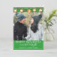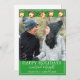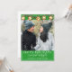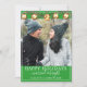 Ein festlich frisch verheiratetes 1. Weihnachtsfest-Foto glückliches Paar Weihnachtskarten Winterszene mit Schlittenglocken auf einem Weihnachtsgrün Hintergrund. Fügen Sie Ihr eigenes Foto hinzu.