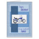 Ein blaues Motorrad auf abstraktem, blauen Hintergrund. Auf der Vorderseite steht "Herzlichen Glückwunsch zum Geburtstag zu meiner wundervollen Verlobte". Eine tolle Karte für einen Verlobte, der Motorradfreund ist. Die Texturen auf der Vorderseite dieser Karte sind gedruckt.