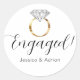 Diese Sonderaufkleber sagen Verlobt!, zusammen mit einem vergoldeten, weißen Diamant-Verlobung-Ring und den Braut- und Ziernamen unten. Ideal für eine Verlobungsfeier!