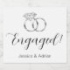 Diese kundenspezifischen Schaumweinetiketten sagen Verlobt!, zusammen mit einem silberfarbenen Verlobung-Ringen mit weißem Diamant und den Namen von Braut und Zwerg. Ideal für eine Verlobungsfeier!
