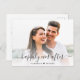 Chic Verlobung Ankündigung Postkarte, die Ihr Foto mit "glücklich immer danach" überlagert in einem eleganten Skript mit Swashes und Ihre Namen durch ein Herz verbunden. Auf der Rückseite, personalisieren Sie Ihre Ankündigung und fügen Sie Ihre Namen in einem signaturähnlichen Skript.