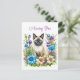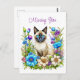 Vermisste dich Postkarte. Schöne siamesische Katze mit blauen Augen in einem Stück von blauen und violetten Blumen ai Kunst in einem Aquarell-Stil.