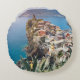 Rundes Foto Throwkissen mit den bunten Häusern der kleinen Fischenstadt Vernazza, eins der Cinque Terre Dörfer, errichtet auf einem Felsen an der Mittelmeerküste von Ligurien, nahe La Spezia in Italien.
