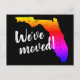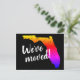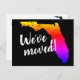 Neonfarbene Postkarten mit Vintager Florida Staat Map Silhouette. Benutzerdefinierter bewegter Text Wir sind umgezogen oder ich bin gezogen. Fügen Sie Ihre neue Adresse auf der Rückseite ein. Moderne, bewegende Karten für Zuhause und Business. Cooles Neonfarbendesign mit stylischer Pinsel-Schrift.