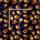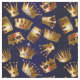 Verschiedene Goldkronen mit Edelsteinen auf blau und schwarz verziertem Hintergrund, nahtlos wiederholtes Muster