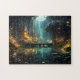 Ein Tempel sitzt inmitten eines magischen aquamarinen Waldes unter dem Licht eines Vollmonds. Eine Brücke in der Nähe führt durch einen kleinen Fluss, der durch die Szene führt. Die orangefarbene Blume und die Blätter werden von winzigen, gelben Lichtern umrahmt.