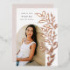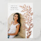 Die schicke und moderne Ankündigung des Abschlusses zeigt ein Single vertikal/portrait orientiertes Foto in einem gewölbten Layout, mit kletternden Reben aus Rose Gold-Folie botanische Blätter auf der rechten Seite. Personalisieren Sie den Namen Ihres Absolventen, das Schuljahr und die Schule, und fügen Sie eine persönliche Nachricht auf den Rücken, zusammen mit einem zusätzlichen Foto.