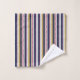 Vertical stripes towel set with a pattern of navy, red, and yellow lines hangs on a wall. Below, a matching washcloth is partially folded, revealing a white underside.