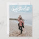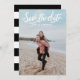 Skripthandschrift Vertikales Foto Ankündigung Datum freihalten. Ein vollständig anpassbares Foto Ankündigung Datum freihalten für Ihre Familie und Freunde. Diese senkrechte Save the Date-Karte zeichnet sich durch eine einfache, weiße Handschrift und schwarz-weiße Streifen aus. Sie können auch die Rückseite der Anzeigenkarte anpassen, indem Sie das Muster mit Ihrem Foto oder einem anderen Bild ändern.