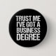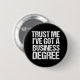 Vertrau mir, ich habe einen Abschluss in Wirtschaft got. Ein Abschluss-Spaß-Button für einen Absolventen, der einen Master in Betriebswirtschaftslehre von einer Uni oder Universität erworben hat. Ein lustiges Zitat von einem Geschäftsmann, einer Geschäftsfrau oder einem Geschäftsmann.