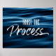 Lassen Sie sich mit einem trendigen motivierend Poster inspiriert. Dieses moderne und stilvolle Design enthält den Text "Trust the Process" in einer passenden Kombination aus einem coolen und urbanen Pinselstrich-Set auf einem lebendigen Foto von ruhigen, blauen Wellen.