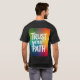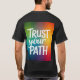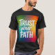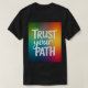Das Design des T - Shirt zeichnet sich durch ein lebendiges abstraktes Muster in einem farbigen Regenbogen aus, der auf einem verschwommenen Hintergrund überlagert ist. Der Begriff "Vertrauenswürdigkeit Dein Weg" wird in einem fett geschriebenen, handgeschriebenen Schriftart hervorgehoben dargestellt, wodurch eine visuell auffällige und aufregende Komposition entsteht. Das Design ermutigt den Einzelnen, an seine Reise zu glauben und seiner Intuition zu folgen.