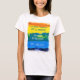 Lustvoller und künstlerischer T - Shirt für den Ruhestand mit "Goodbye tension / Hello pension" + "No boss / No problem" + "Ret. [Monat Jahr]" auf der Vorderseite. Dieses Tee hat einen künstlerisch-bunten Hintergrund mit Bändern von lebhaften Farben: Orange, Gelb, Grün, Himmelblau und Ozeanblau. Ein großes Überraschungsgeschenk im Party für jemanden, der das Gemälde oder andere künstlerische Aktivitäten in Anspruch nehmen kann.