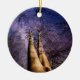 Dieses Design zeigt ein schönes Bild von zwei hohen Bäumen, die sich in den Himmel erheben, umgeben von anderen Bäumen in einem Wald. Die Szene ist das Set in der Nacht, wenn alles aussieht besonders magisch und bezaubernd. Es gibt eine Vogelherde, die über der Luft liegt. Der Himmel besteht aus einer wunderschönen Mischung aus lila und blau; er ist mit hellen weißen Sternen übersät.