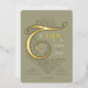 Diese elegante Hochzeitseinladung enthält eine große, verzierte Goldfolie "T", die als Leitsatz für den Satz "Die Hochzeit von" dient und eine großartige und raffinierte Einführung in die Einzelheiten der Hochzeit schafft. Die aufwändige Goldfolienscrollarbeit rund um den Text verleiht dem gedämpften Salbei-grünen Hintergrund ein luxuriöses Gefühl, während die klassische Serifentypografie die formale Ästhetik verstärkt. Die Rückseite der Karte setzt die minimalistische Eleganz mit einem delikaten monogramm-Stil fort. Ideal für feierliche und hochkarätige Hochzeitsfeiern kombiniert diese Einladung zeitlose Designelemente mit zeitgenössischer Eleganz. Die harmonische Mischung aus Salbeigrün, Goldfolie und cremefarbenen Tönen ist ideal für Paare, die eine raffinierte und stilvolle Einladung suchen.