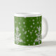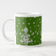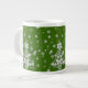 Trinken Sie Ihren Kaffee, Tee oder heiße Schokolade im festlichen Stil aus dieser Jumbo-Tasse (20 oz) mit meinem Foto eines weißen Weihnachtsbaumschmucks und dem Hintergrund mit digitalen Kunstschneeflocken. Das Design befindet sich auf einem transparenten Hintergrund, sodass Sie auf eine andere Hintergrundfarbe als Grün klicken können.