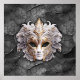 Eine Venezianische Maske mit verziertem Gold und Weiß, das Set vor einem knackigen, dunkelgrauen Hintergrund. Zu den Verzierungen der Maske zählen zarte filigrane und schimmernde Juwelen.