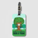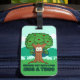 Zweigstelle mit Liebe und Umarmung Ein Baumgepäck-Anhänger, mit einer naturlich inspirierten Szene eines lustigen glücklichen Baumes mit großen gooofy Augen und einem breiten freundlichen Grinsen. Der Baumstamm ist braun, die Blätter grün mit herzenförmigen Äpfeln. Unten sind zwei Vorlagen in einem chunky lustigen grünen Schriftart mit einem schwarzen Strich. Eine Lesart "Verzweigen mit Liebe" und die andere Lektüre "Umarmen eines Baumes" Diese können so verwendet werden, wie sie sind, oder Sie können die Vorlagen verwenden, um Ihren eigenen Text hinzuzufügen. Der Hintergrund ist eine einfache Naturlandschaft mit Bäumen, Gras und Wolken. Ideal für Baumliebhaber, Naturliebhaber und eine Liebe für die Umwelt.