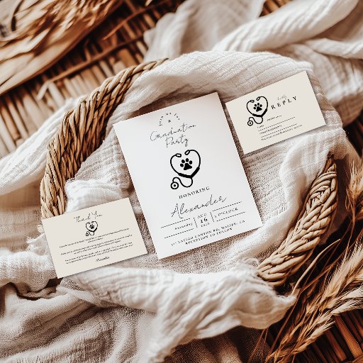 This graduation party design is created especially for a veterinarian graduate, featuring a clean, minimalist layout with a stethoscope and paw illustration. The modern black-and-white style keeps the focus on the achievement while adding a subtle, professional nod to veterinary medicine.