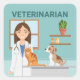 Desteis originelle niedliche Cartoon-Abbildung einer Tierärztin, die in einem Untersuchungsraum einer Tierklinik stehend ist. Der Tierarzt trägt einen weißen Labormantel, blaue Skulpturen und hat ein Stethoskop um den Hals. Der Tierarzt hat braunes Haar und einen lächelnden Gesichtsausdruck. An der Wand befinden sich eine Fensterwand und zwei braune, schwebende Regale mit einer grünen Pflanze und zwei kleinen, auf sie platzierten Medizingläsern. Neben dem Tierarzt befinden sich eine orangefarbene Katze und ein brauner und weißer Welpen, der auf einem grauen Untersuchungstisch sitzt. Es gibt auch einen personalisierbaren Textbereich, der jetzt lautet: "Veterinär".