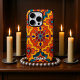 Dieses Bild ist ein abstraktes, bunt gefärbtes Muster mit einer erhöhten, glänzenden Textur, als ob es mit dicken Email- oder Harzschichten gemalt wäre. Das Design ist ein symmetrisches, kaleidoskopähnliches Arrangement Bio Formen in fett orangefarbenen, gelben, roten und blauen Farbtönen. Die Formen sind miteinander verbunden und haben eine dreidimensionale Qualität, mit dicken Konturen und einem fließenden, flüssigen Aussehen.
