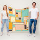 A vibrant abstract pattern with rectangles of varying sizes in teal, orange, peach, and cream tones, outlined in dark brown. Geometric and retro feel.