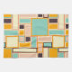 A vibrant abstract pattern with rectangles of varying sizes in teal, orange, peach, and cream tones, outlined in dark brown. Geometric and retro feel.