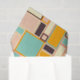 A vibrant abstract pattern with rectangles of varying sizes in teal, orange, peach, and cream tones, outlined in dark brown. Geometric and retro feel.