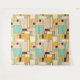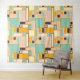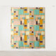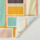 A vibrant abstract pattern with rectangles of varying sizes in teal, orange, peach, and cream tones, outlined in dark brown. Geometric and retro feel.