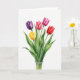 This design shows a watercolor bouquet of five rounded blossoms arranged closely in a clear glass vase, set against a white background that keeps the focus on the flowers 🌷. A deep purple flower leans to one side like a steady companion, while a warm yellow bloom nestles near its base as if sharing a quiet moment. On the other side, soft pink petals and a rich red blossom press in together, their overlapping edges suggesting closeness and easy friendship. Broad green leaves fan out around the stems, and the light, see-through paint lets the petals look airy and gently layered. Through the glass, thin stems crisscross and bend, adding a tender, intertwined look that feels almost like a small embrace 🐇. The greeting sits near the top in a light gray tone, with a smaller line of text centered below the vase in the same color. The vase is outlined with pale blue-gray washes, and faint reflections pool at the base where the stems meet the water line.