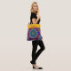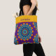 The pattern on this multicolored bag is mainly blue with orange and red accents added. Add purple as a background color, and it makes a vibrant pattern where eclectic charm meets everyday functionality. The pattern is repeated on the backside, but in a smaller scale. An eye-catching bag that will add a pop of color to any outfit!