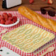 A vibrant geometric pattern with hexagonal shapes outlined in orange and teal on a soft yellow background, creating a retro, rhythmic visual effect.