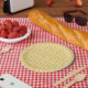 A vibrant geometric pattern with hexagonal shapes outlined in orange and teal on a soft yellow background, creating a retro, rhythmic visual effect.