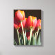Diese gewickelte Leinwand bietet ein nahes Foto einer lebhaften, gelb umrandeten Orangentulpe, die auf einem Blumenfoto nah ist.