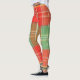 Structure: Features bold, repeating horizontal bands dominated by bright red, interspersed with sections of sage green and brown. The central vertical lines are prominent bright white.