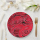Vibrant, close up photograph of a bunch of red roses on party products and favors.