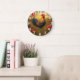 Sunset farmhouse clock featuring a colorful rooster perched on wood, surrounded by red roses under golden twilight. White numerals on warm-toned backdrop create rustic charm—perfect for kitchen decor or farm lover gifts.