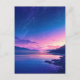 This breathtaking postcard captures a magical moment where a brilliant pink and purple sunset meets a deep indigo night sky. The upper half of the scene features a dense, glowing Milky Way and a canopy of shimmering stars, while the horizon radiates a warm, golden light. The calm ocean waters mirror the vibrant sky, creating soft reflections that lead to a rugged, dark shoreline of silhouetted rocks. With its high-contrast color palette and ethereal atmosphere, this piece evokes a sense of deep peace and cosmic wonder. This postcard is a perfect choice for sending a hopeful message, a peaceful greeting, or as a beautiful keepsake for those who love the sea and sky.