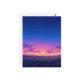 This ethereal postcard captures the magical transition between day and night over a sprawling countryside. The foreground is alive with a lush carpet of blue, purple, and yellow wildflowers nestled in deep green grass. As the eye moves toward the horizon, a brilliant pink and orange sunset glow warms the sky before deepening into a vast, star-studded indigo. Soft purple clouds drift across the center, adding depth to the celestial display. With its dreamlike atmosphere and high-contrast color palette, this piece evokes a sense of profound peace and natural wonder. This postcard is a beautiful choice for sending a hopeful message, a nature-inspired greeting, or as a serene decorative keepsake.