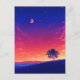 This striking postcard captures a dramatic twilight transition over a quiet hillside. The scene features a brilliant gradient sky moving from a warm, fiery orange at the horizon to a vivid magenta, then a deep indigo night sky dotted with stars and a luminous blood-red moon. A solitary tree stands in bold silhouette on a grassy ridge, overlooking a peaceful valley with distant blue mountain peaks. With its high-contrast color palette and dreamlike atmosphere, this artwork evokes a sense of magical evening solitude. This postcard is a perfect choice for sending a bold message, a contemplative greeting, or as a beautiful keepsake for those who love celestial landscapes.