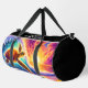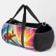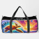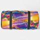 This colorful design duffel bag showcases a vibrant and artistic colorful pattern of a swimming sea turtle amidst a breathtaking sunset and ocean waves. It's a stylish and functional travel accessory, perfect for anyone seeking an expressive and unique design in their carrying bag.