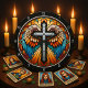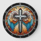 This magnificent wall clock showcases a detailed stained glass design of a majestic cross with beautifully outstretched wings, rendered in a spectrum of vibrant oranges, blues, and whites. The intricate patterns and radiant colors create a truly inspiring and serene focal point, perfect for adding spiritual elegance to any home or sacred space. Edit color of the clocks numbers in the Design tool to your favored colors.