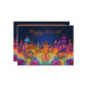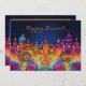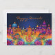 Diese "Happy Diwali"-Grußkarte zeichnet sich durch ein lebendiges, faszinierendes Design aus. Auf der Oberseite der Karte steht der Text "Happy Diwali" in elegantem Kursiv, in einer warmen goldorangen Farbe geschrieben. Der Hintergrund zeigt ein beleuchtetes Stadtbild, das an die traditionelle indische Architektur erinnert, mit verschiedenen Kuppeln, Türmen und Türmen. Diese Strukturen sind in lebhaften, lebhaften Farben gestrichen - hauptsächlich Purpel, Orangen, Blues und Pinks - und schaffen eine festliche und fröhliche Atmosphäre. Im Vordergrund stehen große, farbenfrohe Blumenmotive mit einem prominenten Lotus im Zentrum, der für Reinheit und spirituelles Wachstum steht. Die Blume sind von einem sanften Glühen umgeben, das die Wärme und das Licht in der Mitte zu Diwali Feiern. Der dunkelblaue Himmel hinter der Stadt schafft Kontrast, wodurch die Gebäude und Blume mit ihrem eigenen Licht zu leuchten scheinen. Die Stimmung der Karte ist gefeiert und strahlend, und der Geist von Diwali mit seiner kühlen, farbenfrohen Palette und symbolischen Elementen von Licht und Schönheit gefangen.