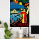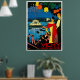 Dieses Vintage Reiseplakat wird in tiefblauem Rot, Blau, Schwarz und Gelb gemacht. Es ist von einer Show auf dem Wasser, die von Männern und Frauen in formalem Kleid am Ufer zu besuchen.