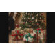 This is a richly detailed, vintage-style Christmas pattern featuring a dense collage of Victorian-era illustrations. It prominently includes depictions of Santa Claus interacting with decorated Christmas trees and various whimsical figures such as elves or gnomes, young children dressed in festive attire, and angels holding greenery. The background has a muted, slightly aged green and gold tone, accented throughout by poinsettia borders and large red candles, all contributing to a heavily nostalgic and traditional holiday aesthetic.
